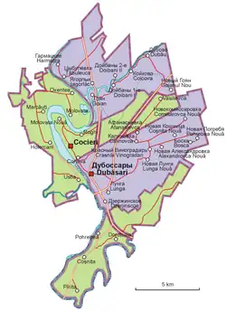 Ustia, Holercani, Marcăuți, Oxentea, and Molovata are situated on the western (right) bank of the river Nistru, while the other 10 villages on the eastern bank. Six of the latter (Cocieri, Vasilievca, Corjova, Mahala, Molovata Nouă, and Roghi) are situated north of the city of Dubăsari, itself under the control of the separatist authorities of Transnistria, and the remaining four (Pîrîta, Coșnița, Pohrebea, and Doroțcaia) south of the city.