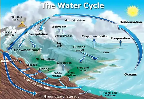 Hydrology is the study of the hydrosphere and the movement of water on Earth. It emphasizes the study of how humans use and interact with freshwater supplies. Study of water's movement is closely related to geomorphology and other branches of Earth science. Applied hydrology involves engineering to maintain aquatic environments and distribute water supplies. Subdisciplines of hydrology include oceanography, hydrogeology, ecohydrology, and glaciology. Oceanography is the study of oceans.[24] Hydrogeology is the study of groundwater. It includes the mapping of groundwater supplies and the analysis of groundwater contaminants. Applied hydrogeology seeks to prevent contamination of groundwater and mineral springs and make it available as drinking water. The earliest exploitation of groundwater resources dates back to 3000 BC, and hydrogeology as a science was developed by hydrologists beginning in the 17th century.[25] Ecohydrology is the study of ecological systems in the hydrosphere. It can be divided into the physical study of aquatic ecosystems and the biological study of aquatic organisms. Ecohydrology includes the effects that organisms and aquatic ecosystems have on one another as well as how these ecosystems are affected by humans.[26] Glaciology is the study of the cryosphere, including glaciers and coverage of the Earth by ice and snow. Concerns of glaciology include access to glacial freshwater, mitigation of glacial hazards, obtaining resources that exist beneath frozen land, and addressing the effects of climate change on the cryosphere.[27]