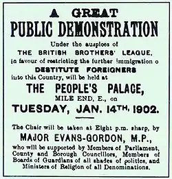 In the 1900 General Election Major Evans-Gordon became the Conservative MP for Stepney on a platform of limiting immigration, winning the seat from the Liberal party. In 1901, Captain William Stanley Shaw and he formed the British Brothers' League which conducted xenophobic agitation against immigrants in the East End, with Jews eventually becoming the main focus. In Parliament in 1902, Evans-Gordon claimed that "not a day passes but English families are ruthlessly turned out to make room for foreign invaders. The rates are burdened with the education of thousands of foreign children."[106] The campaign led to the Aliens Act 1905, which gave the Home Secretary powers to regulate and control immigration.[107]