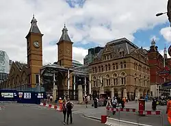 The first railway (the "Commercial Railway") to be built, in 1840, was a passenger service based on cable haulage by stationary steam engines that ran the 3.5 mi (5.6 km) from Minories to Blackwall on a pair of tracks. It required 14 mi (22.5 km) of hemp rope, and "dropped" carriages as it arrived at stations, which were reattached to the cable for the return journey, the train "reassembling" itself at the terminus.[62] The line was converted to standard gauge in 1859, and steam locomotives adopted. The building of London termini at Fenchurch Street (1841),[63] and Bishopsgate (1840) provided access to new suburbs across the River Lea, again resulting in the destruction of housing and increased overcrowding in the slums. After the opening of Liverpool Street station (1874), Bishopsgate railway station became a goods yard, in 1881, to bring imports from Eastern ports. With the introduction of containerisation, the station declined, suffered a fire in 1964 that destroyed the station buildings, and it was finally demolished in 2004 for the extension of the East London Line. In the 19th century, the area north of Bow Road became a major railway centre for the North London Railway, with marshalling yards and a maintenance depot serving both the City and the West India docks. Nearby Bow railway station opened in 1850 and was rebuilt in 1870 in a grand style, featuring a concert hall. The line and yards closed in 1944, after severe bomb damage, and never reopened, as goods became less significant, and cheaper facilities were concentrated in Essex.[64]