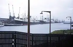 The West India Docks were established in 1803, providing berths for larger ships and a model for future London dock building. Imported produce from the West Indies was unloaded directly into quayside warehouses. Ships were limited to 6000 tons.[59] The old Brunswick Dock, a shipyard at Blackwall became the basis for the East India Company's East India Docks established there in 1806.[60] The Millwall Docks were created in 1868, predominantly for the import of grain and timber. These docks housed the first purpose built granary for the Baltic grain market, a local landmark that remained until it was demolished to improve access for the London City Airport.[61]
