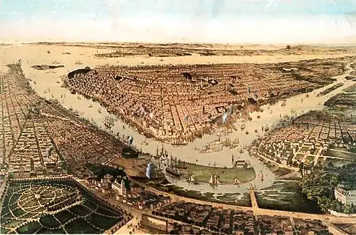 Dutch settlement of what became New Amsterdam began in 1623.[16] Some of the earliest of the small settlements in the area were along the west bank of the East River on sites that had previously been Native American settlements. As with the Native Americans, the river was central to their lives for transportation for trading and for fishing.[17] They gathered marsh grass to feed their cattle, and the East River's tides helped to power mills which ground grain to flour. By 1642 there was a ferry running on the river between Manhattan Island and what is now Brooklyn, and the first pier on the river was built in 1647 at Pearl and Broad Streets. After the British took over the colony in 1664, which was renamed "New York", the development of the waterfront continued, and a shipbuilding industry grew up once New York started exporting flour. By the end of the 17th century, the Great Dock, located at Corlear's Hook on the East River, had been built.[16]