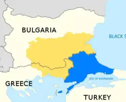 East Thrace (blue) within Thrace (yellow)