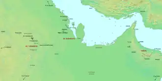 Eastern Arabia, also known as Greater Bahrain or Bahrain Region (Arabic: ٱلْبَحْرَيْن, romanized: Al-Baḥrayn), is a historical region encompassing the eastern part of the Arabian Peninsula stretching from Basra to Khasab[1] along the coast of the Persian Gulf. It includes parts of the modern-day states of Bahrain, Iraq (Basra Governorate), Kuwait, Oman, Qatar, Saudi Arabia (Eastern Province), and the United Arab Emirates. The entire coastal strip of Eastern Arabia was known as "Bahrain" for a millennium.[1]