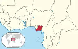 The Eastern region of Nigeria was geographically located in Southeastern Nigeria.[3] It is bordered by the Niger river in the West and has an administrative and cultural border with the Northern region of Nigeria to the north. The eastern boundary lies between the border of Nigeria and Cameroon and the southern coast is along the Gulf of Guinea. The total surface area of the region was approximately 76,000 square kilometres (29,400 sq mi).[3] In 1965, the region had a population of twelve million people and some areas such as Owerri and those inhabited by the Annangs were one of the most densely populated places in West Africa.[4] The Awka region also suffered from soil erosion.