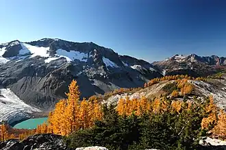 The Alpine Ecoregion makes up much of the North Cascades. Alpine areas such as this are rugged with rocky ridges, snowfields, partially vegetated terrain, and are above the natural treeline.[10] The timberline in the Alpine Lakes Wilderness is found at approximately 6,000 feet (1,800 m).[7] The average annual temperature is 37.5 °F (3 °C) with only a mean annual precipitation of 46 centimetres (18 in).[8] These conditions along with winds and blowing ice are not conducive for trees. Because of the extreme temperatures and low precipitation there are few plant species as compared to lower elevation ecosystems and they are simpler in structure.[7] However, precipitation, or lack thereof, is a more important limiting factor than temperature.[7] Both plant and animal species have adapted in many different ways to deal with this challenging environment.