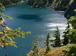 The Western Hemlock Ecoregion huddles in the lower west-side elevations of the North Cascades. Western hemlock is found from sea level up to 2,500 feet (800 m) in elevation.[6] In the Alpine Lakes Wilderness this ecoregion can be found in the lower elevations around 1,000 to 2,000 feet (300 to 600 m)[7] The average annual temperature is 47 °F (8 °C) and it gets between 70 and 300 centimetres (30 and 120 in) in precipitation per year.[6] This ecoregion is evidenced by the dense stands of western hemlock, Douglas fir, western red cedar and red alder.[7] The understory is primarily composed of salal, hazel, salmonberry, devil's club and Oregon grape.[7] The western hemlock (Tsuga heterophylla) is an extremely shade tolerant tree and it is common to find its seedlings and saplings in the understories of the forest floors.[6] It prefers moist temperate conditions. As conditions get drier and colder they don't fare as well.[6] Western hemlocks can reach over 200 feet (60 m) in height with a diameter of 3 to 4 feet (0.9 to 1.2 m).[6] They can be identified by their drooping leader at the top of the tree.[6] It is not uncommon to find western hemlocks growing in a row on a nurse log.[6] The Western Hemlock Ecoregion offers an abundance of life. Black-tailed deer graze in their understories.[6] Fox, coyotes, cougars, and an assortment of herbivore mammals and birds can also be found in these low elevation forests.[6]