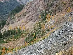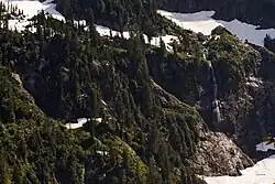 The mid-elevation forests in the North Cascades with an elevation between 2,000 and 4,300 feet (600 and 1,300 m) is the Silver Fir Ecoregion.[6] The Silver Fir Ecoregion makes up for much of the valleys in the Alpine Lakes area. The average annual temperature in this ecoregion is 42 °F (6 °C) and the average precipitation in centimeters is between 220 and 280 centimetres (87 and 110 in).[8] Typical montane forests in this ecoregion is dominated by Pacific silver fir and also contains noble fir, Douglas fir, and Alaska yellow-cedar.[6][8] Coarse woody debris is very characteristic of the Silver Fir Ecoregion, providing microsites for organisms. The Pacific silver fir zone is in some of the steepest parts of the topography and heavy snow often leads to avalanche gullies.[6] In every major drainage basin along the western slopes of the Cascade Mountains there is evidence of avalanche tracks breaking up the forested vegetation with nonforested vegetation.[6] These gullies provide sites of new successional growth as they move toward a coniferous forest again.[6] Because of the dense forests of the Silver Fir Ecoregion, it was the preferred area for commercial logging prior to designation of areas as wilderness.