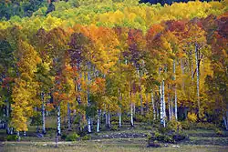 Lodgepole pine forests interspersed with stands of quaking aspens are fire-resilient forests that dominate the central and north-central Rocky Mountains. Usually found between 8,200 and 10,500 feet (2,500 and 3,200 m) in Colorado, lodgepole pines and aspens grow rapidly after fire in mostly even-aged stands.[1] In the Canadian Rockies, the lodgepole pine/quaking aspen forests occur in the foothills, mixed with white spruce and balsam poplar.[13] In the northern Canadian Rockies, black spruce also occurs in this biotic zone.[13]