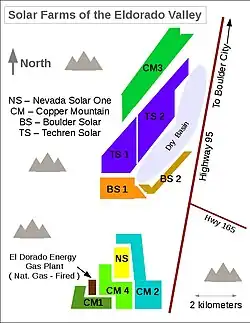 The northern valley contains Boulder City's "Eldorado Energy Zone" which is home to the 480 MW El Dorado natural gas power plant completed in the year 2000.[4] Since 2007, it is also home to the concentrated solar power plant, Nevada Solar One, as well as a growing number of photovoltaic power stations, including:[5][6][7]