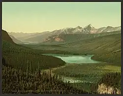 The first non-indigenous person to set sight on Emerald Lake was Canadian guide Tom Wilson, who stumbled upon it by accident in 1882. A string of his horses had gotten away, and it was while tracking them that he first entered the valley. The lake had an impression on him: "For a few moments I sat [on] my horse and enjoyed the rare, peaceful beauty of the scene." It was Wilson who gave the lake its name because of its remarkable color, which due to a different rock type producing the sediment that is suspended in the glacial water, reflects the green spectrum of sunlight rather than the blue spectrum seen in Moraine, Hector, Bow and Peyto Lakes in neighboring Banff National Park. However, this was not the first time Wilson had named a lake 'Emerald'. Earlier that same year he had discovered another lake which he had given the same name, and that name appeared briefly on the official map. This first lake was shortly renamed Lake Louise.[3]