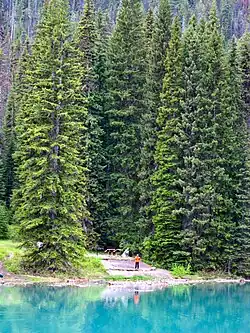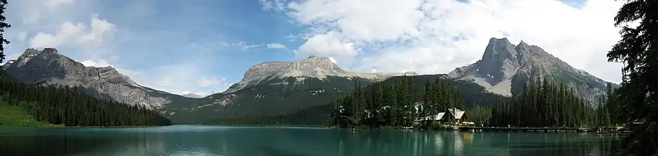 Emerald Lake is enclosed by mountains of the President Range, named after the President and Vice-President of the coast to coast Canadian Pacific Railway, built in 1885 and which runs through Yoho National Park. Other peaks are Mount Burgess and Wapta Mountain. The Emerald Basin opens to the west and traps rain and snow storms, causing frequent rain in summer and heavy snowfalls in winter. This influx of moisture works with the lake's elevation of 1200 meters / 4400 feet above sea level to produce a unique selection of flora. Trees found here are more typical of B.C.'s wet interior forests of the Columbia Mountains immediately to the west, such as western red cedar, western yew, western hemlock and western white pine. The alluvial fan on the northeast shore produces wildflowers in abundance during late June and early July.[2]