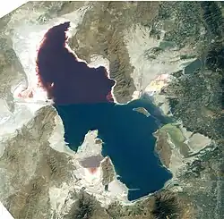 An endorheic lake (also called a sink lake or terminal lake) is a collection of water within an endorheic basin, or sink, with no evident outlet.[1] Endorheic lakes are generally saline as a result of being unable to get rid of solutes left in the lake by evaporation.[2] These lakes can be used as indicators of anthropogenic change, such as irrigation or climate change, in the areas surrounding them. Lakes with subsurface drainage are called cryptorheic.