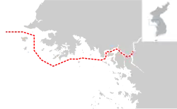 The Korean Armistice Agreement specified a Military Demarcation Line as a land border between North and South Korea, but failed to determine a maritime border. The United Nations Command of the Military Armistice Commission (UNCMAC), however, unilaterally set two maritime borders, one at the Yellow Sea and one at the Sea of Japan, known as Northern Limit Lines (NLL).[2] Ever since the legal status of the NLLs has been contested and clashes have taken place.[3] In 1973, North Korea explicitly challenged the validity of the Yellow Sea NLL. UNCMAC had accused North Korea of intruding to the south of the NLL, to which North Korea responded by claiming that its maritime boundary lies south of the NLL.[4]