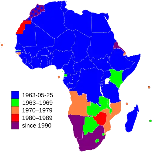 - South West Africa – A colony of the United Kingdom under the mandate of South Africa, the territory wouldn't become independent until March 21, 1990, as Namibia. It joined the OAU in June of that year.