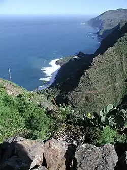 Fajã (Portuguese pronunciation: [fɐˈʒɐ̃], of unknown etymology) is a Portuguese term of obscure origin used to describe supratidal talus at the foot of coastal cliffs, caused by landslides or lava flows.[1] Although relatively common world-wide, they are distinctive features of the Azores and Madeira, as well as of the Canary Islands, where the equivalent term in Canarian Spanish is fajana (Spanish pronunciation: [faˈxana]).[2] The term also designates a small flat piece of land, generally cultivable and located by the sea, formed of materials fallen from cliffs.[3][4] Another Canarian word for lava fajanas is isla baja,[5] literally, "low island".