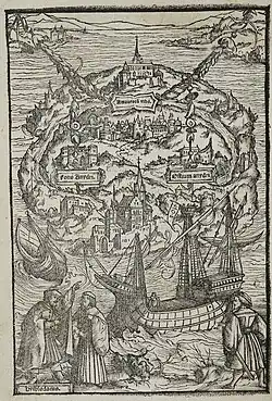 In 1516, Thomas More published his Utopia accompanied by a map of the island.[15] This map inspired artistic cartographers over the sixteenth century to iterate the original.[16]