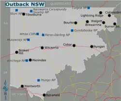 The Far West region of New South Wales, Australia refers generally to the western part of the state, which is too dry to support wheat or other crops or intensive pastoral endeavours. It is west of the North West Slopes, Central West and the Riverina. It is an area with limited rainfall. The only major rivers found in it are the Darling River and the Murray River (on its southern edge), which originate in the Great Dividing Range to the east. The region corresponds to the combination of the Australian Bureau of Meteorology's forecast areas of Upper Western and Lower Western.[1] It also corresponds to the Western Division established under the New South Wales Western Lands Act 1901.[2][3]