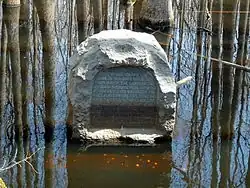 The initial point was located as the place where these surveyed lines intersected (this is one of many examples where the meridian line and base line determined the initial point, rather than the other way around). As a result the initial point is in the middle of a high water swamp, on land that belonged to the Davidsons of Marvell, Arkansas. The family made this portion of their farm available to the state, and today the site, Louisiana Purchase State Park, consists of a 900-foot (270 m) boardwalk leading from a parking lot into the swamp. At the terminus of the boardwalk there is a granite monument which reads, "This stone marks the base established Nov. 10, 1815 from which the lands of the Louisiana Purchase were surveyed by United States Engineers, the first survey from this point was made to satisfy the claims of the soldiers of the War of 1812, with land bounties. Erected by the Arkansas Daughters of the American Revolution. Sponsored by the L'Anguille Chapter."