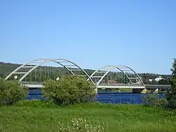 Through the entire river border, near the eastern shore, the Finnish national road 21/European route E8 runs between Tornio and Kilpisjärvi. The Swedish national road 99 runs near the western shore along most of the border. Bridges across the river border can be found in Karesuvanto/Karesuando (road 959/E45), Muonio (road 954/404), Kolari (road 943/403), Pello (road 937/402) and in Aavasaksa/Övertorneå (road 98).[17] There are also two river bridges in Tornio (one carries the European route E4, also Finnish national road 29),[17] but they don't cross the border. The border is crossed by three roads in Haparanda/Tornio. South of the centre, the Torne River Railway Bridge crosses the river and the border.[2]
