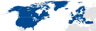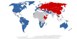 After World War II, the world split into two large geopolitical blocs, separating into spheres of communism and capitalism. This led to the Cold War, during which the term First World was often used because of its political, social, and economic relevance. The term itself was first introduced in the late 1940s by the United Nations.[3] Today, the terms are slightly outdated and have no official definition. However, the "First World" is generally thought of as the capitalist, industrial, wealthy, and developed countries. This definition includes the countries of North America and Western Europe, Japan, South Korea, Australia, and New Zealand.[4] In contemporary society, the First World is viewed as countries that have the most advanced economies, the greatest influence, the highest standards of living, and the greatest technology. After the Cold War, these countries of the First World included member states of NATO, U.S.-aligned states, neutral countries that were developed and industrialized, and the former British Colonies that were considered developed.