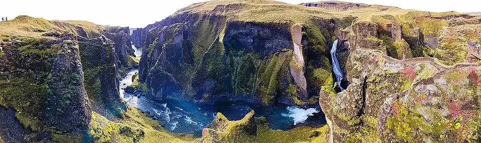 The canyon has steep walls and winding water. It is up to 100 m (330 ft) deep[1] and about 2 kilometres (1.2 miles) long.[2] It is located near the Ring Road, not far from the village of Kirkjubæjarklaustur.[3]