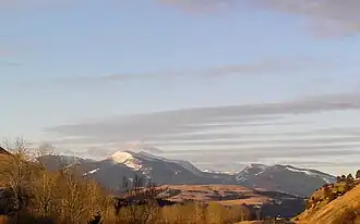 About 60,000 acres of the Flints are roadless.[3] From Deer Lodge, Montana, there appears to be a level, barren ridge connecting Mount Powell and Deer Lodge Mountain, el. 9765 ft. However, if one is traveling eastbound on Interstate 90, in the stretch between Drummond and Garrison, Montana, looking up one can see that this ridge is actually a sheer cliff called "The Crater."[3] The Crater is characterized as "[g]iant granite ribs resembling the backbone of a dinosaur" by Cunningham.[3] The Flints have the typical Rocky Mountain fauna, including a few mountain goats. The area is popular for hunting of deer, elk, and blue grouse, but otherwise appears to receive little recreational use.[3] Dozens of alpine lakes in the range provide good fishing.[4]