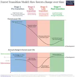 Forest transition refers to a geographic theory describing a reversal or turnaround in land-use trends for a given territory from a period of net forest area loss (i.e., deforestation) to a period of net forest area gain.[1][2][3][4][5][6][7] The term "landscape turnaround" has also been used to represent a more general recovery of natural areas that is independent of biome type.[2][8]