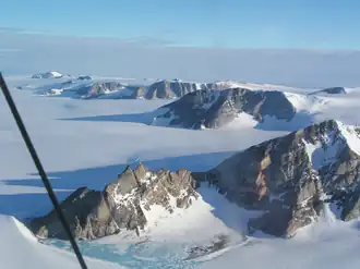 Aerial view to the east of north escarpment, Fosdick Mountains. Mount Bitgood in the near field, Mount Colombo middle distance, Mount Perkins is the peak at the horizon.