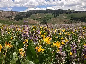 View of the Fox Creek Range from Copper Basin during summer wildflower season | |