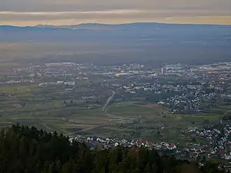 ![]() View of Offenburg looking west, with the Vosges (Mont Donon) in the background | |