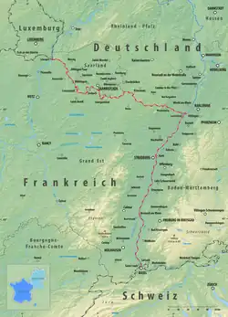 Upstream of Karlsruhe (48°58′01″N 8°14′02″E / 48.967°N 8.234°E), the border leaves the Rhine, cutting westward to forming the northern border of Alsace and Lorraine on the French side, and the southern border of Rhineland-Palatinate and Saarland on the German side. It passes Saarbrücken, Petite-Rosselle, Freyming-Merlebach, Creutzwald (where it follows the Bist for a short stretch), Überherrn, and meets the E29 before it terminates at the French-Luxembourgish-German tripoint on the Moselle, near the village of Schengen, Luxembourg (49°27′36″N 6°22′08″E / 49.460°N 6.369°E; chosen as the symbolic site for the signing of the Schengen Agreement between France, Germany, and the Benelux countries in 1985).
