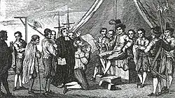 Drake also met the Native Coast Miwok people and soon had friendly interactions with them exchanging gifts while the English were given food.[56] In a particularly significant gesture, a large assembly of Coast Miwok descended on the encampment and honoured Drake by placing chains around his neck, a sceptre in his hand, and a crown of feathers on his head as if he were being proclaimed king. Upon this uncertain, seemingly voluntary surrender of sovereignty by its owners, England based its presumed legal authority to the territory.[57] Drake thus claimed the land in the name of the Holy Trinity for the English Crown as called Nova Albion – Latin for "New Britain" and for Queen Elizabeth I. Drake chose this particular name for two reasons: first, the white banks and cliffs which he saw were similar to those found on the English Channel coast and, second because Albion was an archaic name by which the island of Great Britain was known. To document and assert his claim, Drake is said to have an engraved Drake's Plate of Brass, one which contained a sixpence bearing Elizabeth's image, attached to a large post. Giving details of Drake's visit, it claimed sovereignty for Elizabeth and every successive English monarch.[58]