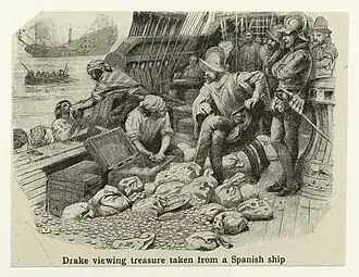 On December 5 he viewed the small Spanish settlement of Valparaíso, a coastal town with a number of houses and a church. He made an assault on the town and plundered what he could find, such as valuable art treasures and the church silver. Its harbour contained a ship which proved the most valuable as it was full of Chilean wine, 25,000 pesos in gold and charts of the South American coast.[38] Drake's sack of Valparaíso gave origin to the legend about Cueva del Pirata.[39]