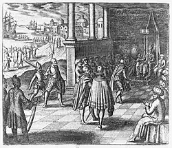 Drake still in pursuit of the Nuestra Señora de la Concepción and unaware of the sizeable Spanish force now coming for him, took a small ship just having departed from Guayas River which led to Guayaquil. The ship belonged to Benito Diaz Bravo and in its hold contained nearly 20,000 gold pesos from the Zaruma gold mines along with other victuals.[44]