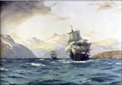 Prior to entering the Strait, in July 1578, Drake sent Wynter ashore where he learned from indigenous people that they ate the astringent Winter's bark.[31] Captain Wynter ordered the collection of great amounts of bark – hence the scientific name.[32] Drake renamed the Pelican as the Golden Hind on 20 August 1578[33] to honour his patron, Sir Christopher Hatton, whose family crest was a golden hind (female red deer). Drake passed through the Strait of Magellan in just 16 days. As soon as they entered the Pacific Ocean, violent storms nearly shattered the remaining ships. The Marigold was never seen again and was presumably lost with all hands. A week later, the Elizabeth became separated from the Golden Hind and was battered to the point that the crew demanded they head home. Wynter, hopeful that he would meet the other ships in turn, demanded that he sail on to the East Indies and rendezvous with Drake. Fearing an all-out mutiny, he reluctantly headed back to England.[34]