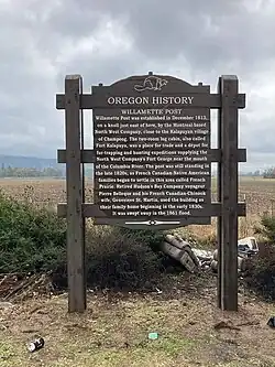 Road signage historical marker (summer 2022) for the Willamette Trading Post