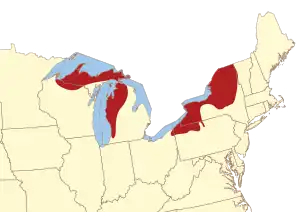 Fruit Belts are prominent around the North American Great Lakes region, notably West Michigan (Fruit Ridge) and western Northern Lower Michigan in tandem,[1][2][3][4] and the southern shore of Lake Erie.[5] The conditions that produce a micro-climate favorable to fruit cultivation are the same that produce lake-effect snow; therefore, Fruit Belts and snowbelts are often concurrent. The map at right shows Great Lakes snowbelts which cover a somewhat larger area than the fruit belt. Notably, there are no Fruit Belts in Michigan's Upper Peninsula. A Fruit Belt also exists in Central Washington.[6] Berries are grown on the West Coast.