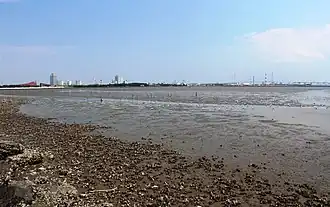 The tidal flat is at the mouths of the Shōnai, Shinkawa, and Nikkō Rivers by the Port of Nagoya.[3] Land reclamation projects started during the Edo period and continued until the 1980s.[2] A plan announced in 1981 to use the Fujimae tidal flat as a waste disposal site was finally abandoned after a long campaign in 1999.[2][4] Due to greater awareness of their function, there are now moves to return reclaimed flats to their original state.[2]