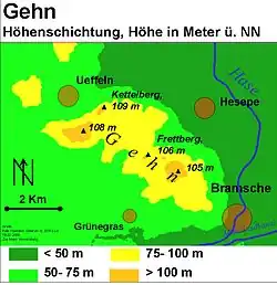The Gehn is a small ridge of hills between Bramsche and Ueffeln in Germany's Central Uplands, that are an extension of the Wiehen Hills (German: Wiehengebirge). The ridge runs from northwest to southeast and is about 5 kilometres (3.1 mi) long and an average of 2 kilometres (1.2 mi) wide. The highest point is the Kettelberg which is 108 m above sea level (NN) high. The Gehn forms a link between the Wiehen Hills and the Ankum Heights (Ankumer Höhe). It is largely forested and is not - like the Ankum Heights- part of a series of ice age terminal moraines from the latest event of the Saalian glaciation, the so-called Drenthe I stage, but is a ridge of Jurassic rock that was pushed up during the folding towards the end of the Cretaceous period.