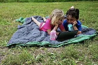 Members of Generation Z often use the term "iPad kid" when referring to Generation Alpha.[94][95] This term was coined due to the majority of Generation Alpha's early childhood being spent watching and interacting with tablets and other smart mobile devices with the assumption of them being addicted.[96] In 2017, a study suggested that at least 80 percent of young children had access to a smart mobile device and schoolchildren had an average screen time of around seven hours a day.[96][97] Apple's iPads are one of the most popular smart mobile devices, hence the name.