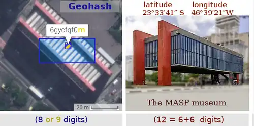 Geocode cells of Geohash, with 8 (blue) and 9 (yellow) digits, a typical hierarchical grid, comparing with latitude-longitude (12 or more digits). A museum is a typical location to be pointed by a geocode, its gate need ~20 meters of precision.