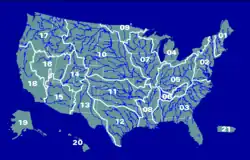 The 21 top-level 2-digit "region" of hydrologic unit boundaries, using the HUC geocode conventions