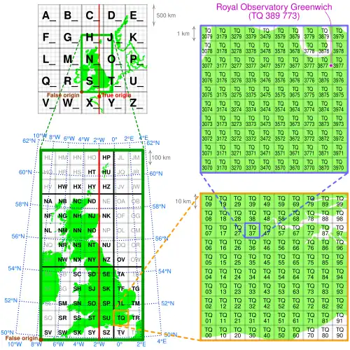 This hierarchical system of local grids, used since the 1930s as British National Grid, generates hierarchical geocodes. Each cell subdivides recurrently its area into a new 10x10 grid.