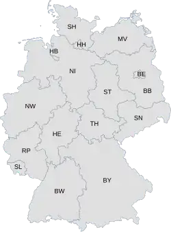 Germany (DE) with each first-level administrative subdivision labelled with the second part of its ISO 3166-2 code