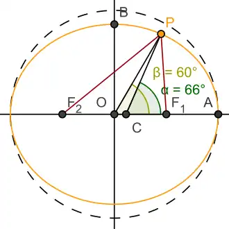 The same position on a spheroid has a different angle for latitude depending on whether the angle is measured from the normal line segment CP of the ellipsoid (angle α) or the line segment OP from the center (angle β). The "flatness" of the spheroid (orange) in the image is greater than that of Earth; as a result, the corresponding difference between the "geodetic" and "geocentric" latitudes is also exaggerated.