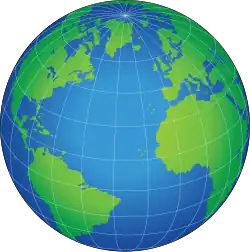 The Earth's tectonic plates move relative to one another in different directions at speeds on the order of 50 to 100 mm (2.0 to 3.9 in) per year.[24] Therefore, locations on different plates are in motion relative to one another. For example, the longitudinal difference between a point on the equator in Uganda, on the African Plate, and a point on the equator in Ecuador, on the South American Plate, increases by about 0.0014 arcseconds per year. These tectonic movements likewise affect latitude.