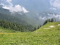 The region is extremely mountainous (nearly 75% is classified as mountains or foothills) and settlement is largely confined to the coast and a number of deep, well-watered valleys.[1] The Greater Caucasus Mountain Range runs along the region's northern border. The Gagra, Bzyb, and Kodori Ranges branch off from the Main Caucasus Range. The highest peaks of Abkhazia are in the northeast and east (along the border with Svaneti) and several exceed 4,000 meters (13,123 ft) above sea level. The highest mountain is Dombai-Ulgen (4,046 m or 13,274 ft).