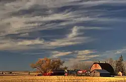 Most of Southern Alberta east of the Rockies and outside of the Cypress Hills, especially Palliser's Triangle, is a dry steppe, with most locations having an annual average precipitation of 280-430mm. Under the Köppen climate classification, most places in Southern Alberta are either semi-arid (Köppen climate classification BSk), or humid continental (Köppen climate classification Dfb)[5] (the "humid" designation denotes that these climates do not meet the criteria to be semi-arid, not that they necessarily have high humidity levels). Most places in Southern Alberta that fall under the "humid continental" classification are close to the borderline between semi-arid and humid continental. The other climates in this area are semi-monsoonal humid continental (Koppen: Dwb) located around Calgary, or subarctic (Koppen: Dfc) located in high elevation areas and the Cypress Hills. This region has the hottest summer temperatures in Alberta and quite cold winters, though chinook winds ameliorate the cold winter temperatures temporarily when they pass over. The natural vegetation of this region is mainly dry mixed grass prairie, grading to mixed grass prairie, and then fescue prairie as precipitation increases with higher altitude and / or latitude.[6] This area is prone to drought and farming here is not successful without significant irrigation.