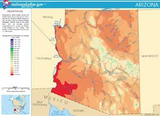 The number of days with measurable precipitation can vary from around 70 in the Flagstaff area to 15 in the Yuma area.[3] The highest elevations of Arizona receive up to 30 inches (760 mm) of precipitation annually, and the southern slopes of the Mogollon Rim and the southeast average between 15 and 20 inches (380 and 510 mm). The driest part of the state is the southwestern region, which receives under 3 inches (76 mm) of rain a year, whilst the northeastern Colorado Plateau is in a rain shadow and receives between 4.5 and 10 inches (114 and 254 mm). Annual average humidity values vary from 55% in Flagstaff to 23% in Yuma. Due to the high temperatures, low humidity, and occurrence of sunshine, Arizona has high rates of evaporation. Average annual lake evaporation varies from about 80 inches (2,000 mm) in the southwestern part of the state to about 50 inches (1,300 mm) in the northeast.[4] During El Niño, the Pacific jet stream enters the U.S. further south of its normal position, making Arizona winters wetter than usual. The opposite phase, La Niña, reinforces the jet streams northern route, making Arizona winters even drier than normal.